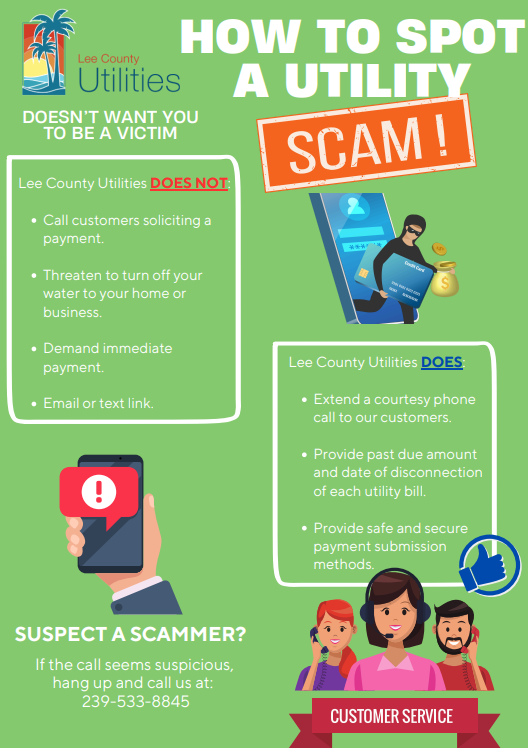 Lee County Utilities (LCU) wants to alert customers to a recent scam involving fraudulent phone calls from individuals falsely claiming to represent our utility. These scammers may threaten service disconnection and demand immediate payment.